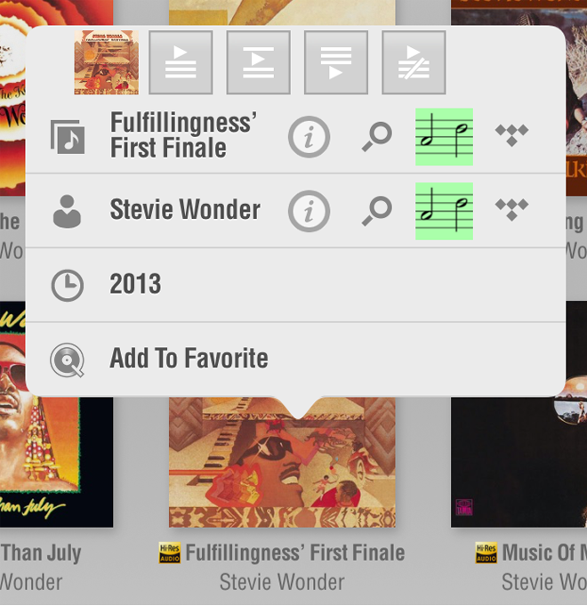 Add to the LUMIN PlaylistYou can press and hold on any item in the browse window that contains just tracks to add all of its contents to the Playlist. See App Browsing for full icon descriptions. Add To Favorite From this menu, you can also store your slection as a Qobuz favorite, for later retrieval from the 'Favorites' section. You can also search your local servers (MinimServer in this example) or Qobuz for artists or songs of the same title. (You can also do the reverse and search Qobuz when browsing through your own server.) |